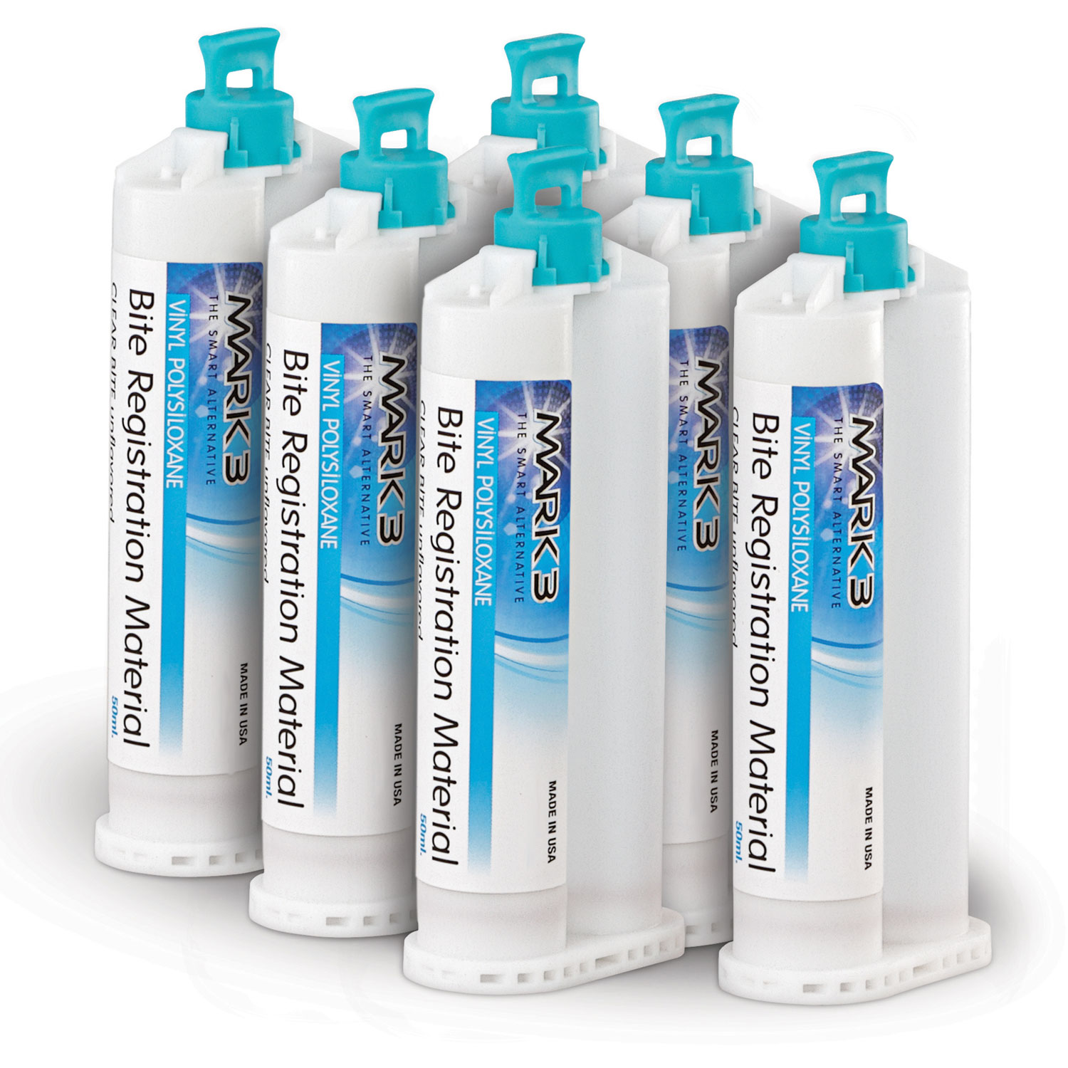 MARK3 Bite Registration Material is mousse-like, fluffy, boasts exceptional accuracy and plaster like hardness. It is extremely dependable with no slump consistency. Used for conventional bite registration, copying transfers, digital impressions, primary impression with bite tray.